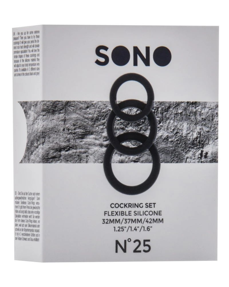 Ce pack de cockrings est le N¬∞25 de la marque SONO. Il est composé de 3 anneaux péniens de 22mm, 25mm et 30mm. Ils permettent de renforcer l’érection et de faire durer le plaisir plus longtemps.Matière silicone
