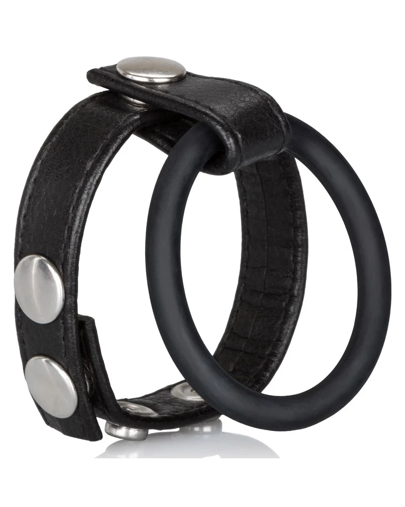 Ce double anneau Ball Leath de la marque Calexotics est un accessoire conçu avec un anneau en cuir avec des pressions pour ajuster le serrage.Son diamètre va de 35 à 55mm. L’autre anneau est souple avec un diamètre de 43mm. Il serrer l’avant du pénis. Les deux anneaux permettent de renforcer plus intensément l’excitation