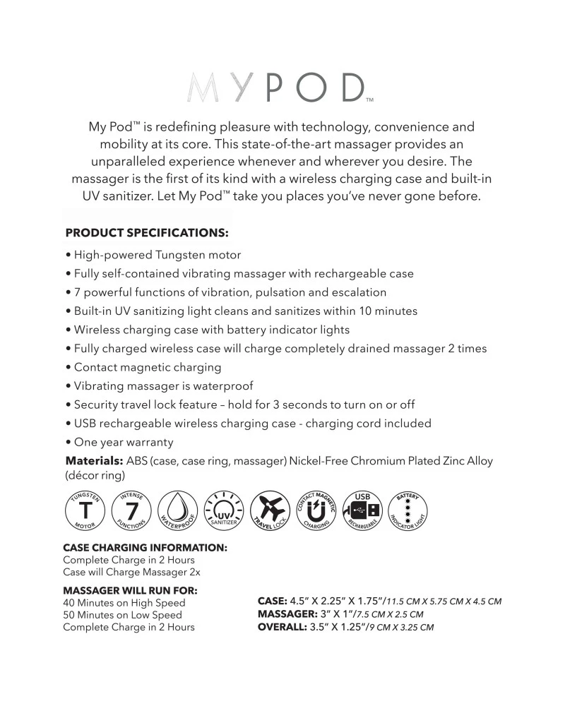 Ce stimulateur de clitoris My pod est un sextoy conçu pour obtenir un plaisir délicat et excitant en solo.Il se compose de : le vibro de 7.5 x 2.5cm avec les 7 modes de vibrations la capsule de nettoyage UV pour une utilisation en toute sécurité. Il peut s’emmener partout.Vibrations silencieuses et puissantes