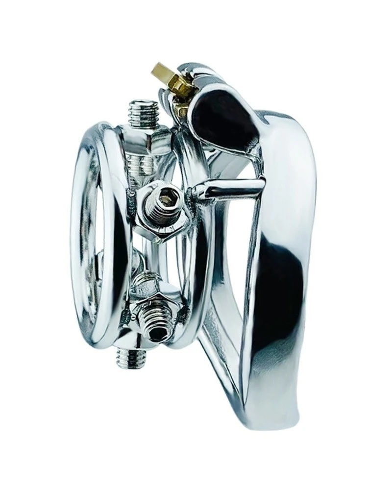 Cette cage de chasteté Annel Pics est conçu avec deux anneaux de 3.2cm avec l’extrémité ouverte laissant passer le pénis. Les 6 pointes ajustables piquent le sexe et permettent de limiter l’érection. Avec un anneau de maintien (diamètre à choisir).Fermeture par clé. Fabriquée en métal