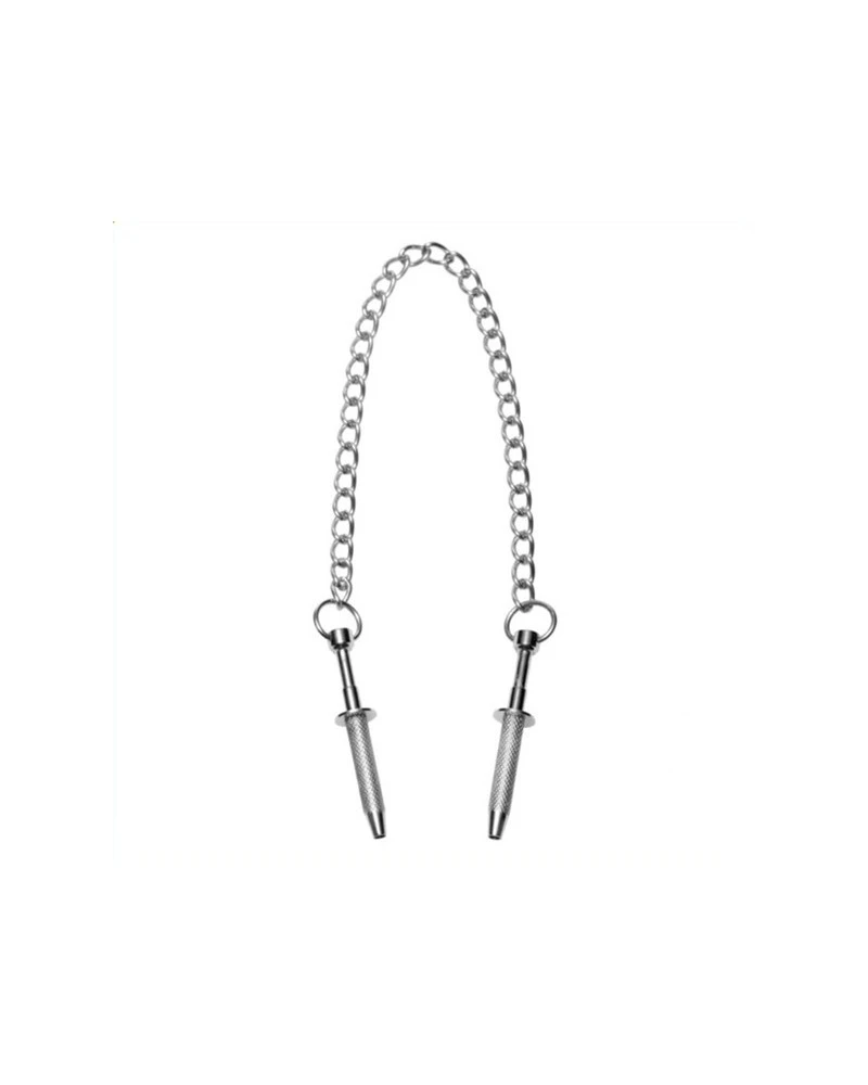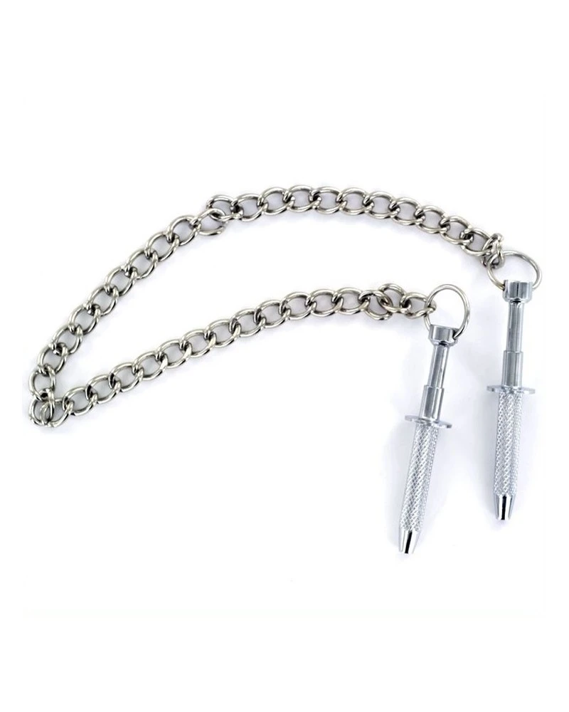 Ces pinces sont des accessoires s’attachant aux tétons pour obtenir des sensations très extrêmes.Elles sont composées de crochets fins s’agrippant facilement par pression. Reliées par une chaîne en métal. Longueur de 6.5cm