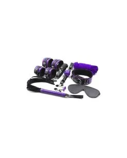 Ce Coffret est composé de 8 accessoires noirs et violets idéals pour le jeu de soumission : un baillon-boule percé des menottes de poignets et de chevilles un masque un collier avec la laisse une corde 10M un martinet des pinces pour les tétons. Fabriqué en simili