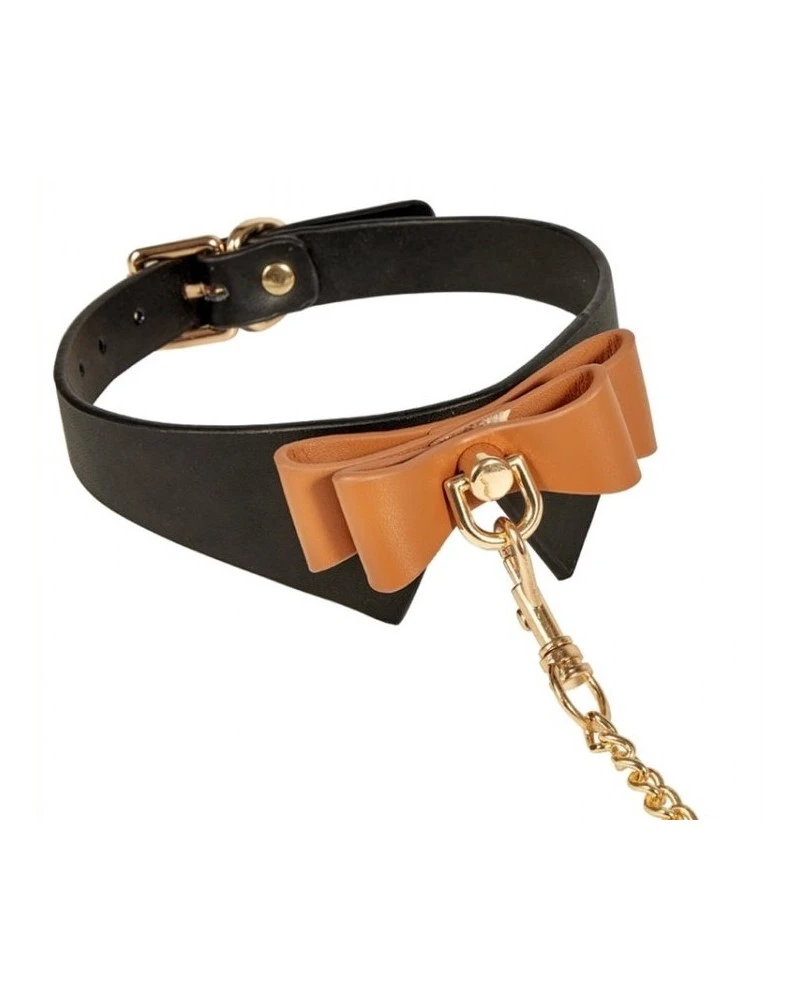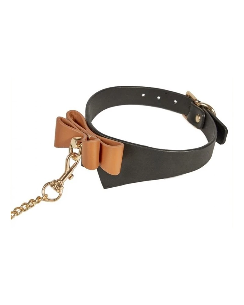 Ces collier et laisse apportent une note élégante aux moments SM. La laisse, les mousquetons et l’anneau sont en métal doré. Le collier est chic et coquin avec son¬†noeud marron. La laisse mesure environ 1m de longueur ¬†