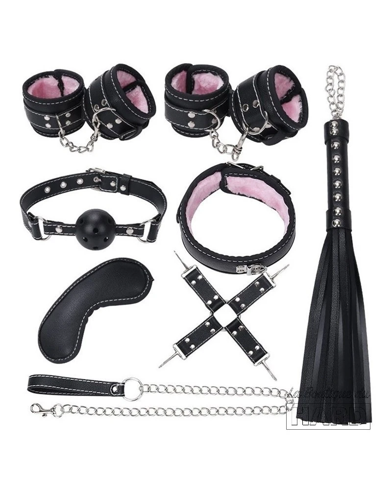 Le Kit Sm Hemming est ici dans sa version Noir-rose.C’est un pack d’accessoires utilisés pour les jeux de soumission composé de :les menottes de poignets et de chevilles avec un intérieur en fourrure rose le collier avec laisse en métal le baillon boule le masque le martinet l’accessoire d’attache pour les menottes.Les éléments sont fabriqués en simili