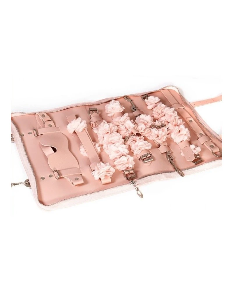 Ce Kit Sm en simili est composé de 7 accessoires permettant des jeux coquins excitants.Il est conçu avec : des menottes de poignets et de chevilles un collier avec une laisse un accessoire en croix pour attacher les menottes un masque un paddle. Avec le sac de rangement. Les accessoires ont des fleurs en tissu à la surface.