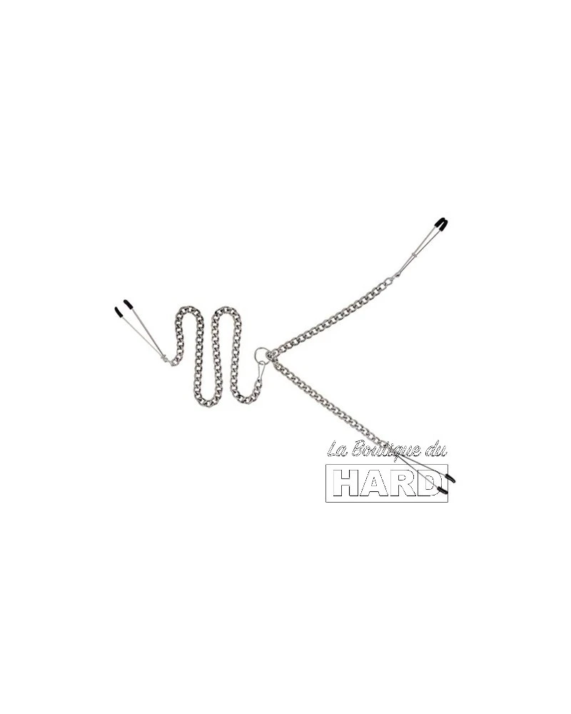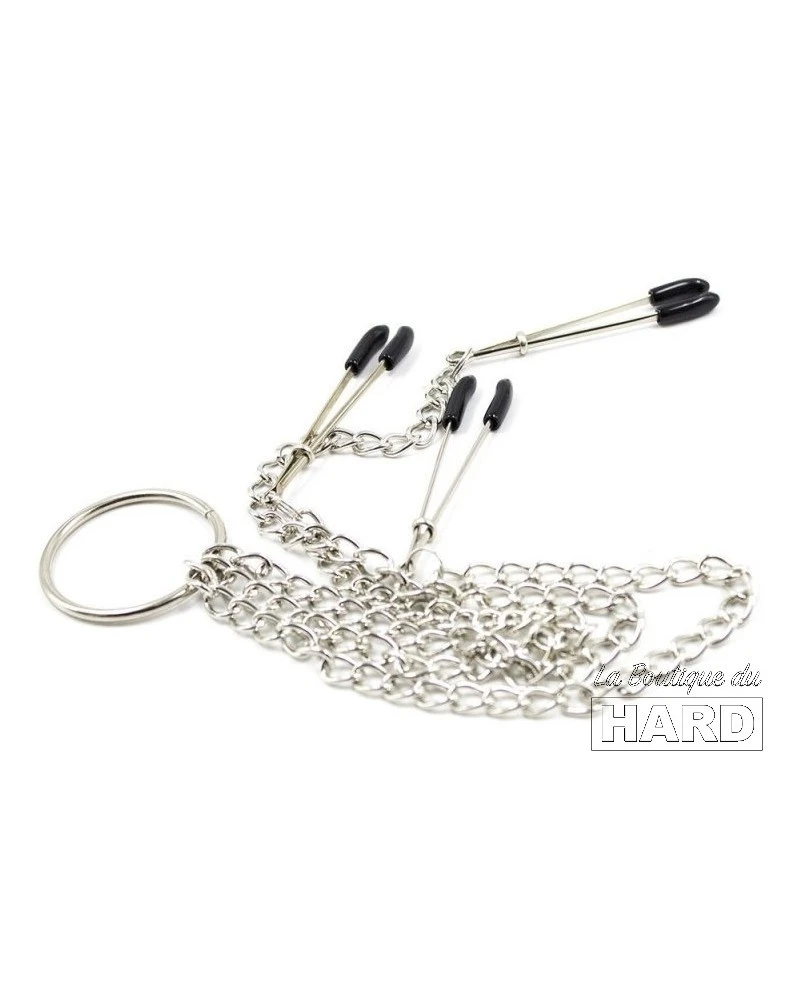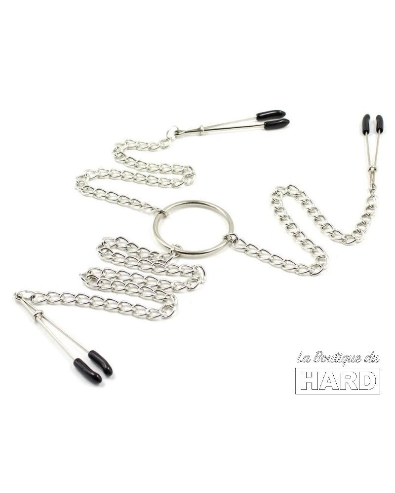 Cet accessoire est composé de 3 pinces se plaçant sur les tétons mais aussi le clitoris. Elles apportent des sensations intenses et stimulantes.Avec un anneau central qui relie les 3 chaînes en métal. Serrage facile et puissant