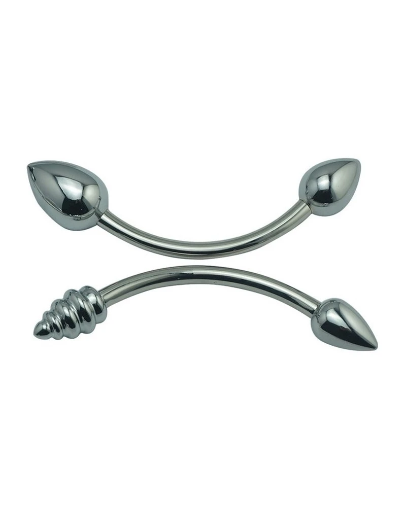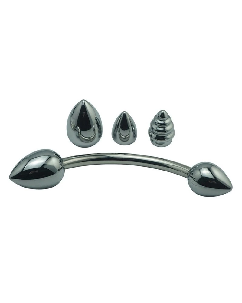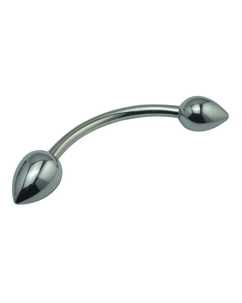 Ce stimulateur de prostate en métal Double Head est conçu avec une forme courbée.Il possède 4 embouts amovibles permettant de varier les sensations lors de l’insertion.Les embouts sont de 4 x 2.7cm lisse, 4.5 x 2.9cm striée, 5 x 3.4cm lisse et 6 x 4.1cm lisse. La partie centrale mesure environ 25cm de longueur.