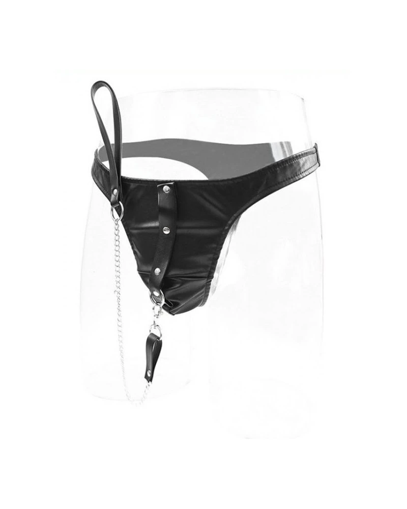 Ce string fetish est complété par une laisse.Il permet de donner un look de soumission. Le sous-vêtement est en simili.La laisse en métal mesure 40cm avec une poignée en simili