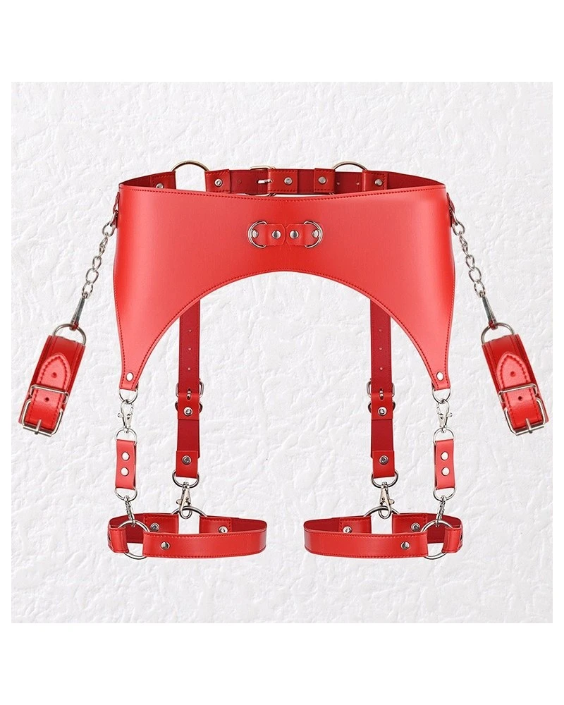 Cet accessoire rouge est un harnais se plaçant à la taille avec une ceinture et un porte-jarretelles.Il est complété par des menottes de poignets. Il est facilement ajustable. Fabriqué en simili (polyuréthane)