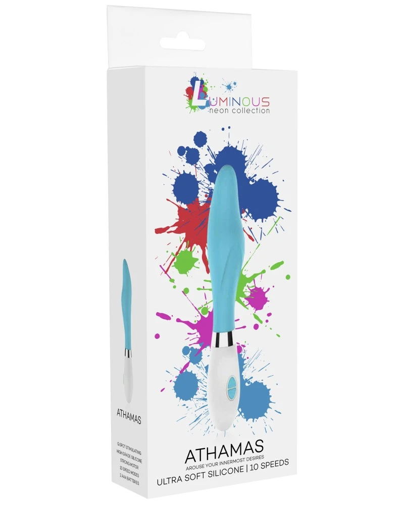 Ce vibro Athamas turquoise est un sextoy conçu avec une forme élégante. Il permet des sensations intenses grâce aux 10 modes de vibrations.La longueur insérable est de 13cm. La largeur maximale est de 3.7cm. Avec une surface lisse et un revêtement en silicone. Fonctionnement nécessitant 2 piles AAA (non fournies)