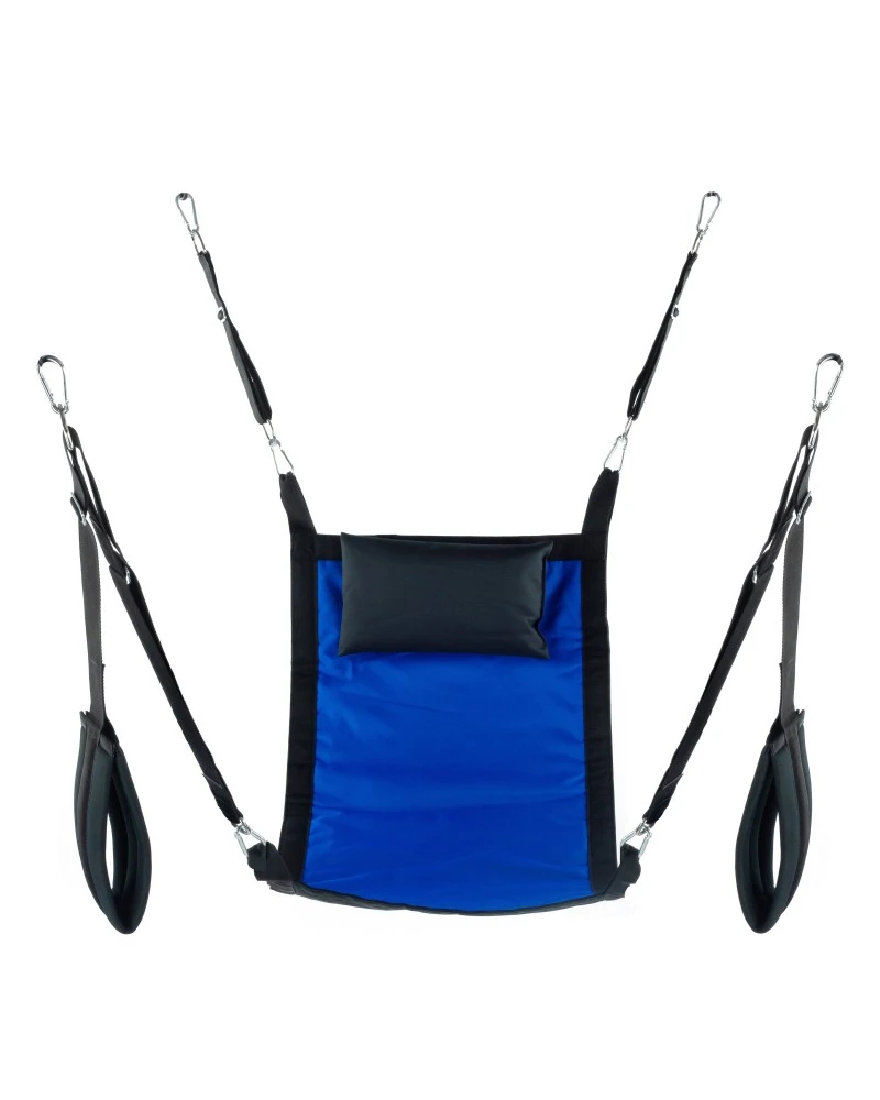 Ce sling en tissu est composé d’une toile bleue avec une forme Rectangle. Il est livré avec les accessoires : les 4 suspensions avec les mousquetons en métal les supports pour pieds rembourrés (largeur de 11cm) le coussin noir (23 x 38cm). Dimensions : 60cm X 107cm ¬† Matière : polyester Avec le sac de rangement