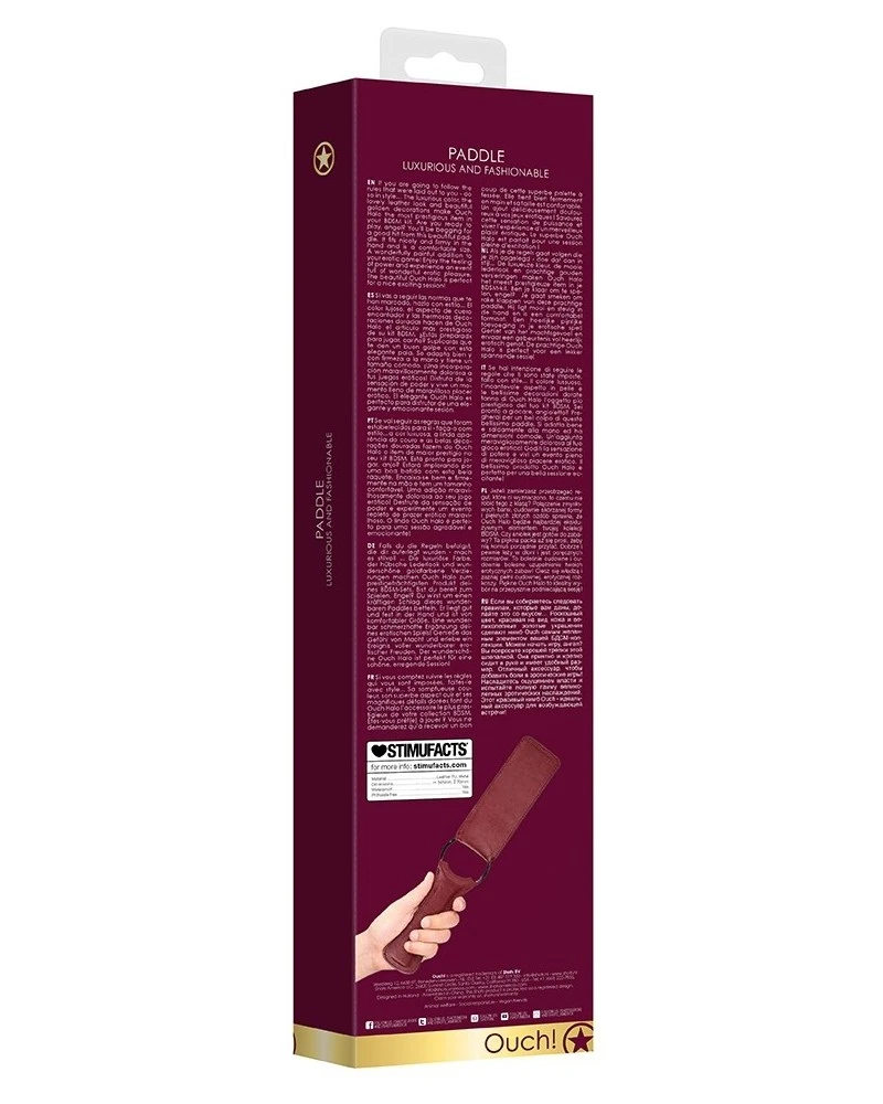 Ce paddle Halo rouge est un accessoire de la marque Ouch!. Il est conçu avec une longueur de 34cm et une largeur de 6.5cm.Avec un anneau central en métal doré. Parfait pour taper les fesses ou les caresser délicatement. En simili (polyuréthane)