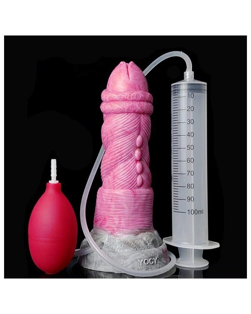 Ce gode éjaculateur est un sextoy original idéal pour simuler une éjaculation. En effet, la seringue et la poire de projeter un liquide (eau ou faux sperme – non fourni).Sa forme est originale avec une surface torsadée et un gland épais avec 2 plis en dessous. La longueur insérable est de 18cm. La largeur maximale est de 5.5cm. Fabriqué en silicone souple