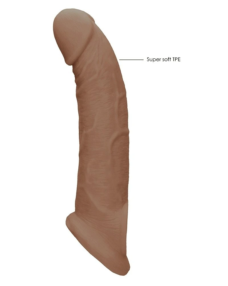 Voilà une gaine de pénis couleur Latino. Elle est proposée par la marque Realrock. Elle permet de rendre le sexe plus volumineux avec : une longueur de 17cm une largeur de 4.5cm la forme réaliste avec gland décalotté et surface veinée. Maintien sur les bourses avec les ouvertures de 25mm de diamètre. En matière souple TPE