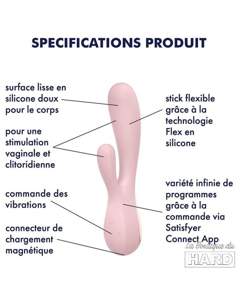 Ce rabbit connecté de la marque Satisfyer est un sextoy parfait pour les moments coquins. Sa forme ergonomique permet de faciliter la stimulation du clitoris. Il possède 2 moteurs puissants permettant de diffuser les vibrations au plus près des zones sensibles et érogènes. Modulation via l’application Satisfyer.En matière silicone flexible. Recharge en USB Caractéristiques :Garantie 15 ans Matière silicone bio-compatible Technologie silicone Flex 2 moteurs super-puissants Mode silencieux Résistant à l’eau Rechargeable en USBDimensions : 20 x 4.4 cm / Poids : 185 grammes