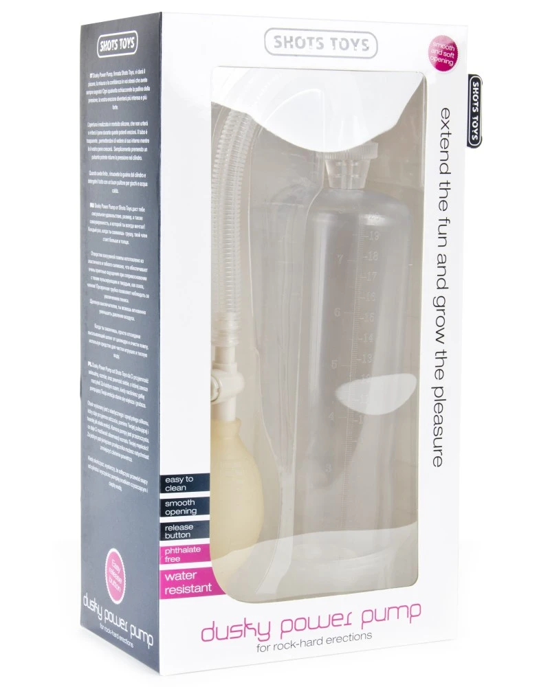 La Pompe à pénis Dusky Power 20 x 6 cm Transparente est un accessoire réalisé par Shots Toys. Sa fabrication permet d’obtenir un engin superbe. Ce sera une phase d’amusement puissant en solo d’employer ce jouet.