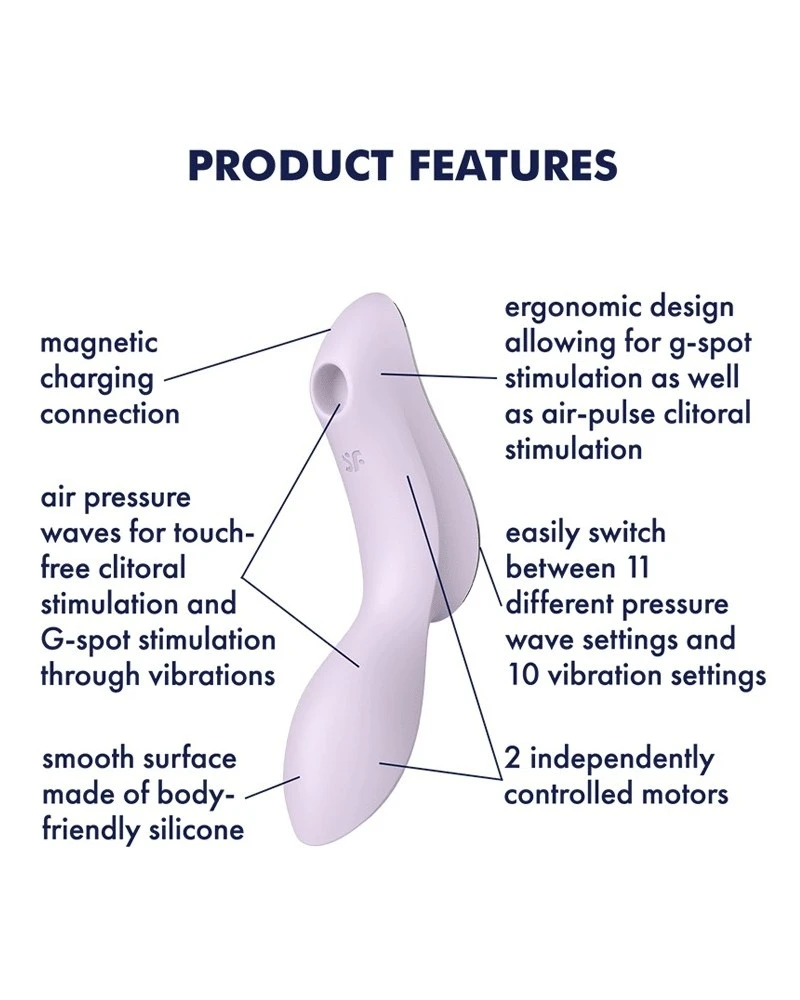 Ce stimulateur de clitoris Curvy trinity 2 est un sextoy Satisfyer conçu avec : 11 modes d’ondes vibratoires qui apportent un plaisir excitant sur le clitoris 12 modes de vibrations pour stimuler le point G. Avec 2 moteurs puissants et silencieux. Longueur totale : 16cm