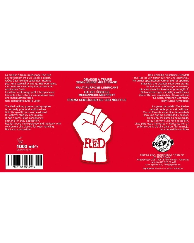 La Graisse à traire en semi-liquide 1 Litre est un lubrifiant fait par The Red. Ses caractéristiques crée un ustensile épatant. Ce sera un temps de bien-être terrible en groupe de se servir ce produit.