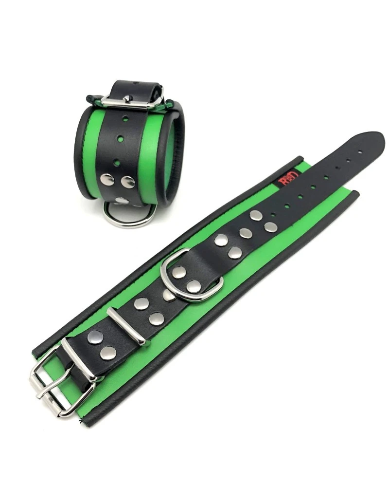Ces menottes sont conçues par la marque The Red. Elles se composent de : un contraste de couleur vert et noir une largeur de 6.5cm des attaches et mousqueton métalliques un tour ajustable allant de 21 à 32mc. En cuir véritable de vache (fabrication Europe)