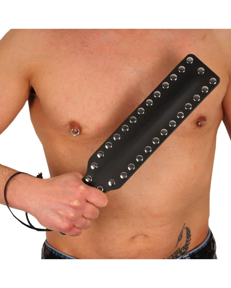 Ce paddle en cuir est composé d’une longueur totale de 38cm avec une largeur de 7.5cm.Chaque côté est complété par 37 rivets en métal pour marquer rouge la peau et les fesses. En cuir véritable de vache. Tannage végétal.Fabriqué en Europe