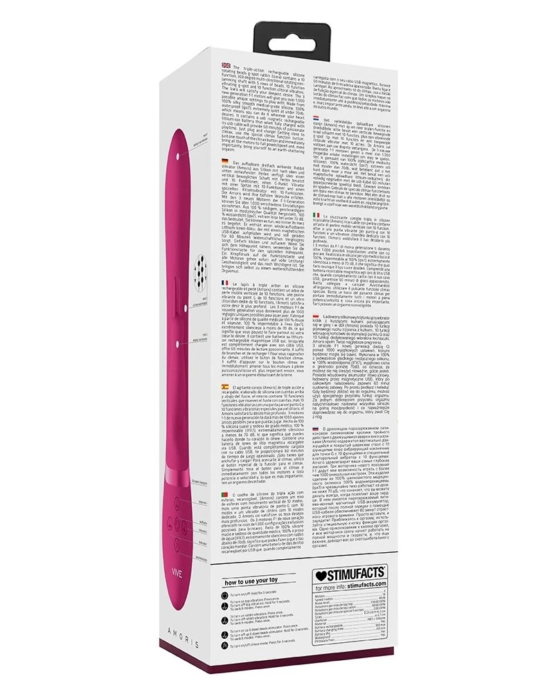 Le vibro rabbit Amoris est un sextoy composé de 2 parties : le vibro de 12 x 3.6cm avec 10 modes de vibrations les billes rotatives à l’intérieur avec des mouvements de haut en bas le rabbit vibrant. 3 moteurs indépendants et 10 rythmes associés